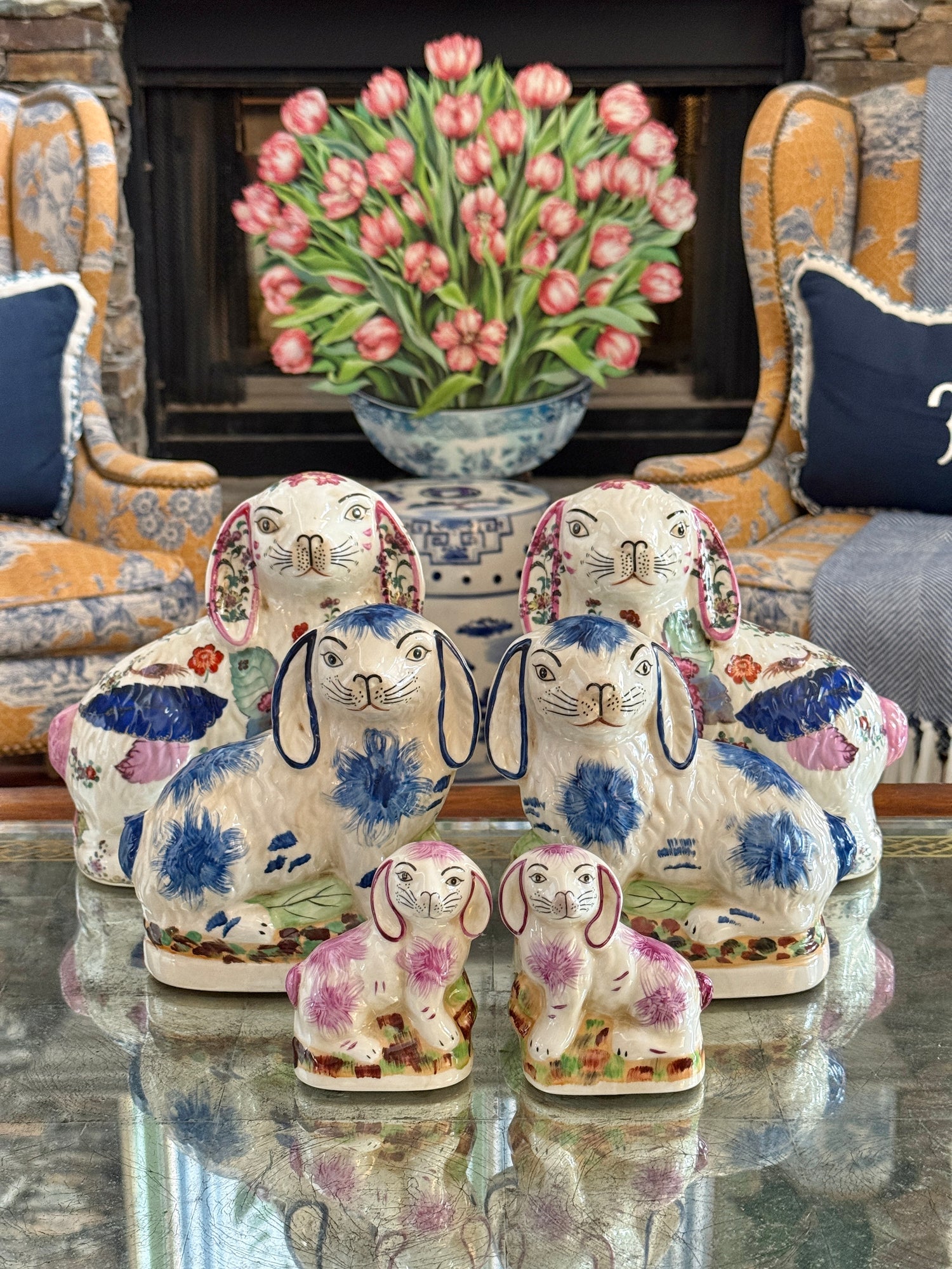 Blue fishnet Staffordshire bunny pair 8.5”- Regular price