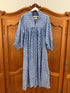 This is it! THE dress you have been asking for! Meet Lillie, our newest cotton block print maxi dress in a generous, breezy caftan style. She has darling puff sleeves and is shown here in a cornflower blue hand block print with contrasting striped accents. This dress is full of sweet details like a perfectly pleated ruffle collar, and elastic ruffle 3/4 length sleeves that are easy to push up (and stay!). Did we mention it has POCKETS!? Whether you're lounging around the house, doing your hair and makeup, or headed out to run errands, this dress is a fun, versatile addition to your closet. Throw it on with sneakers or sandals, it’s truly a go anywhere dress!