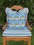 Blue and green floral block print pillow cover with ruffle trim