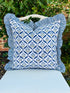 This darling frill cushion is hand block printed and expertly tailored in India. It features a charming blue and green floral trellis print with a hand gathered blue and white striped ruffle trim. *presale ships in 1-2 weeks*