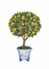 Free-standing wooden calamondin orange topiary in a blue and white chinoiserie pot.