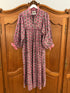 This is it! THE dress you have been asking for! Meet Lillie, our newest cotton block print maxi dress in a generous, breezy caftan style. She has darling puff sleeves and is shown here in a lavender and red hand block print floral fabric with contrasting striped accents. This dress is full of sweet details like a perfectly pleated ruffle collar, and elastic ruffle 3/4 length sleeves that are easy to push up (and stay!). Did we mention it has POCKETS!? Whether you're lounging around the house, doing your hair and makeup, or headed out to run errands, this dress is a fun, versatile addition to your closet. Throw it on with sneakers or sandals, it’s truly a go anywhere dress!