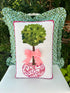 This darling hooked wool rectangular pillow features a ball topiary in a pink and white chinoiserie pot on a white background. The pink velvet bow at the base is just too cute!