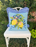 We are smitten with this new addition to the hand hooked pillow collection! It features two lemons with blue ribbons and pink blossoms on a light blue background.
