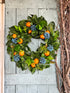 A fresh twist on our popular orange wreath! Vibrant Clementine oranges and blueberry bundles are tucked into a base of classic, glossy magnolia leaves.