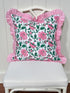 Pink and emerald green vine floral block print pillow cover with pink striped ruffle trim