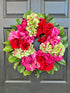 Bright, bold, lush, and festive describe this full, fluffy new addition to the holiday collection! Pink peonies, red velvet hydrangeas, and green hydrangeas tipped in pink come together to make a fabulous, eye catching wreath. Pairs perfectly with our outdoor wreath sash in Sunbrella stripe! (Sold separately)