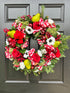 Our exclusive handmade roses and gingham wreath is classic style meets fun! This full, fluffy wreath is packed full of red rose blooms, sedum, black and white anemones, and red and white gingham dupioni ribbon woven throughout.