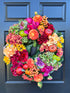 We took our bestselling Mackie wreath and made it Fall! She’s big, bright, fun, and elegant. This wreath is packed full of high end life-like botanicals including orange dahlias, fuchsia peonies, hydrangeas, cabbages, pears, and red apples.