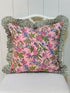This darling frill cushion is hand block printed and expertly tailored in India. It features a charming floral print with a hand gathered pink striped ruffle trim. Available in 3 colors! White, pink, and beige.