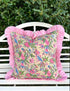This darling frill cushion is hand block printed and expertly tailored in India. It features a charming floral print with a hand gathered pink striped ruffle trim. Available in 3 colors! White, pink, and beige.