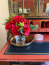 Simply classic and beautiful! Our red roses drop-in bouquet features 2 types of realistic faux garden roses along with winter greens and variegated pittosporum leaves. Hand tied with a deep red velvet bow. Vase not included